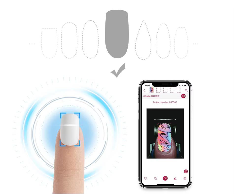 One-click automatic identification, automatic identification of nail shape and size which can match with the pattern automatically. Support manual adjustment of pattern position and size at the same time. Easy to do beautiful nail printing, everybody can be a manicurist.