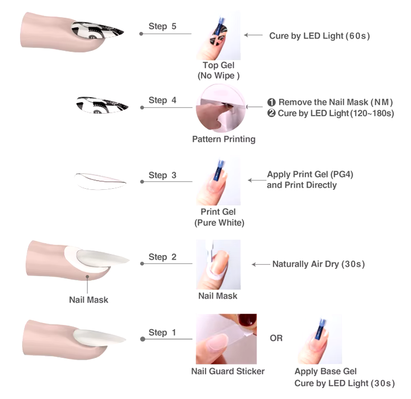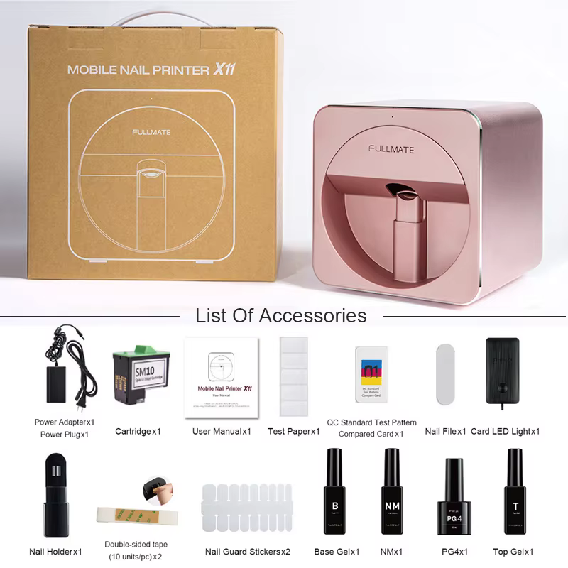 - Lease a nail printer and provide all consumables, including ink cartridge, nail guard sticker, nail mask, print gel(PG4), glossy top gel, etc