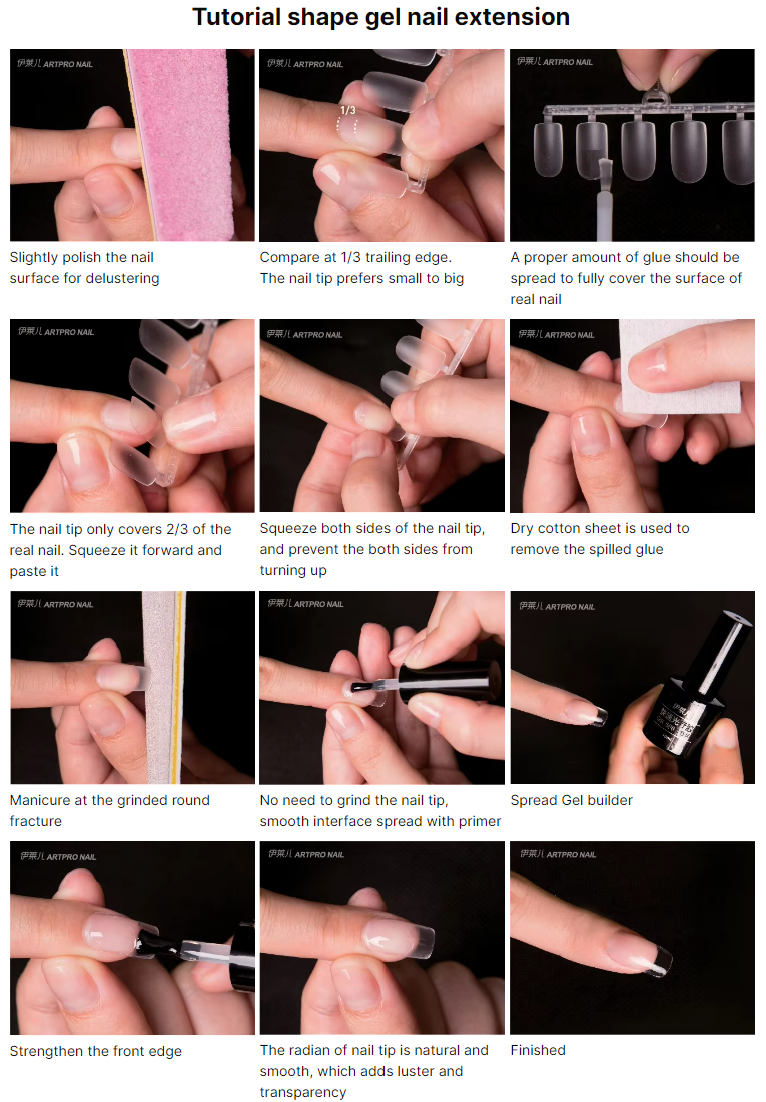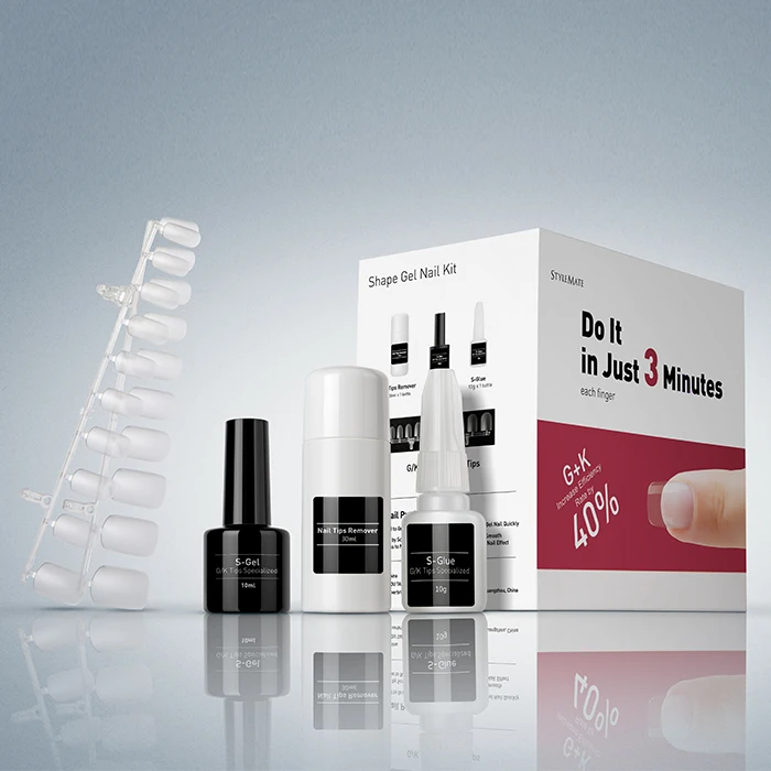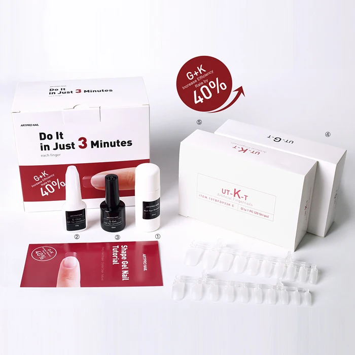 G + K set Cover the nail surface. Each 3-minute Shape Gel Nail Kit including: 20 G transparent nail tips and 20 K transparent nail tips.