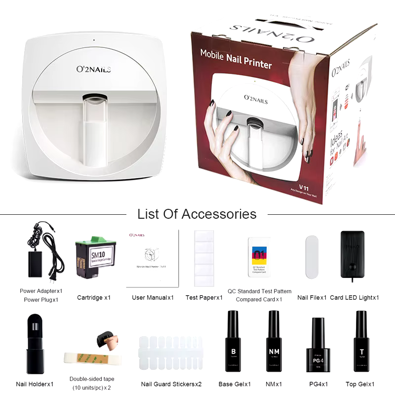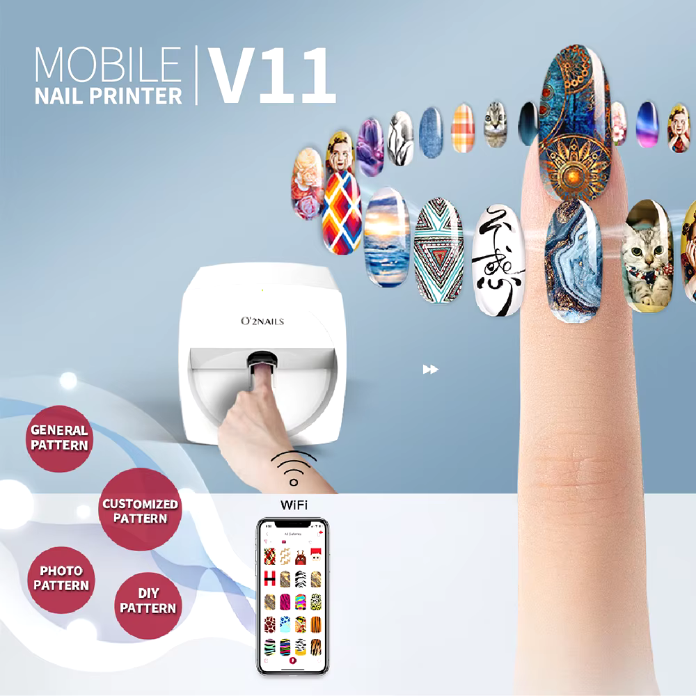 O'2NAILS nail art printer, a perfect contaminated of nail art and printing with high-tech, can print any pattern on your natural nails, artificial nails, or nail tips around 30 seconds.